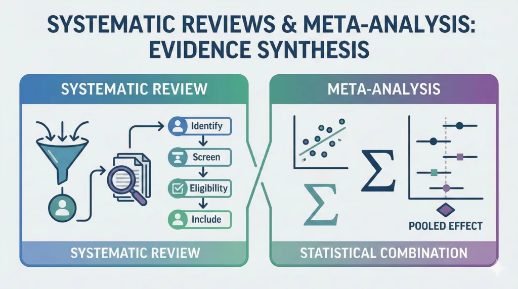 The gold standard. PRISMA guidelines, data extraction, and meta-analysis basics.